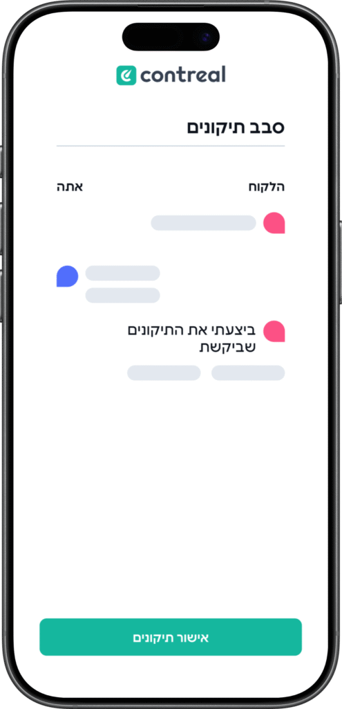 מנהלים את הלקוח מהווטסאפ עם הבוט המובנה של Contreal שהופך כל הודעה, קובץ או בקשה מהלקוח למשימות מסודרות בתוך הפרויקט.