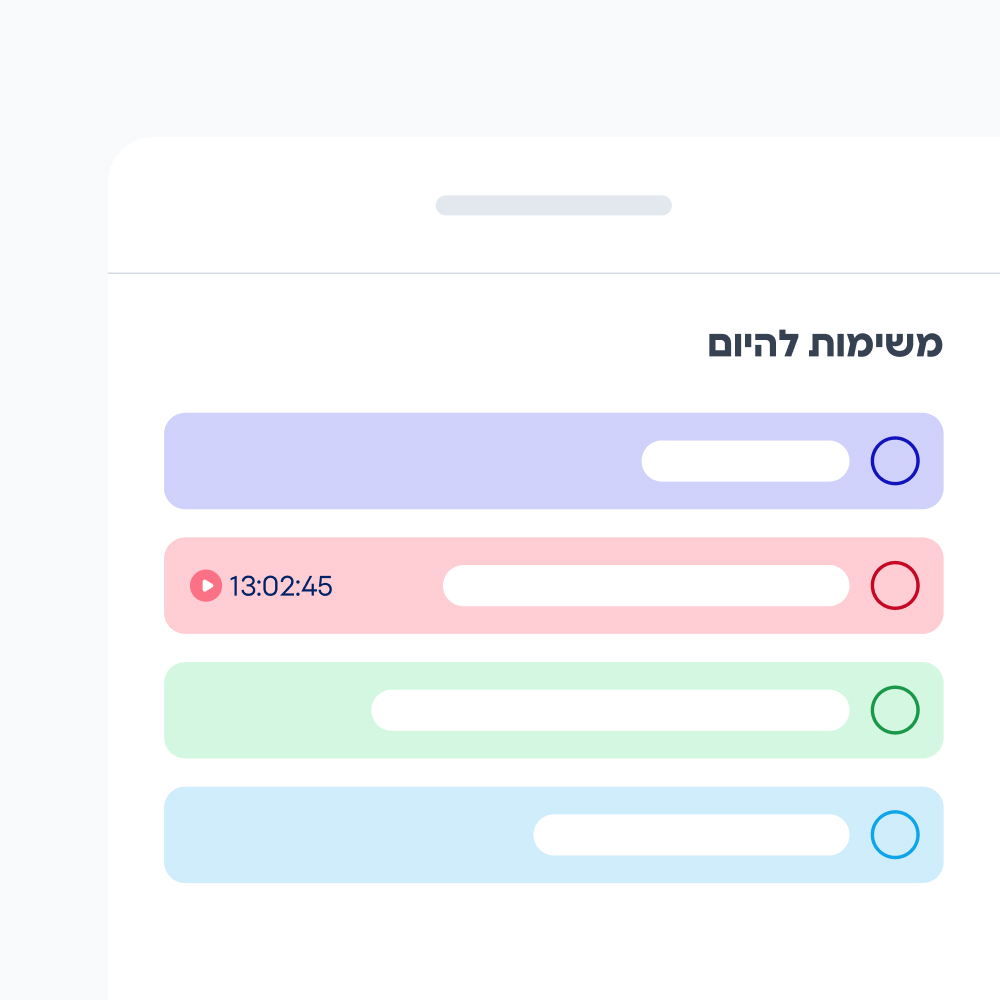 הטיימר המובנה במערכת מתעד את זמן העבודה בפועל, והמערכת מחשבת רווחיות, התקדמות ועומסים בזמן אמת.